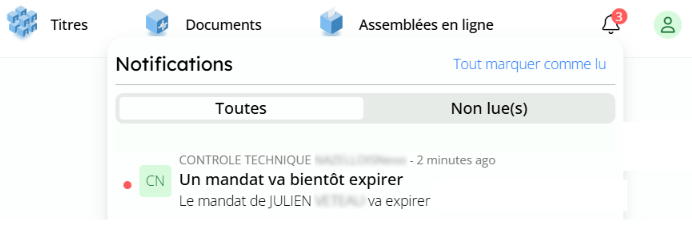 • Depuis le menu “Notifications” de l’espace de travail, il est possible d’activer les notifications de fin de mandat.