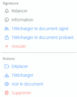 • Relancer : permet de demander Ă  nouveau une signature aux personnes n’ayant pas encore signĂ© le document. Uniquement accessible lorsqu’il manque une ou plusieurs signatures