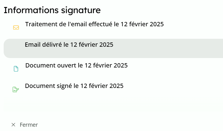 • Information : permet d’accĂ©der Ă  l’historique des actions liĂ©es Ă  la signature Ă©lectronique du document.