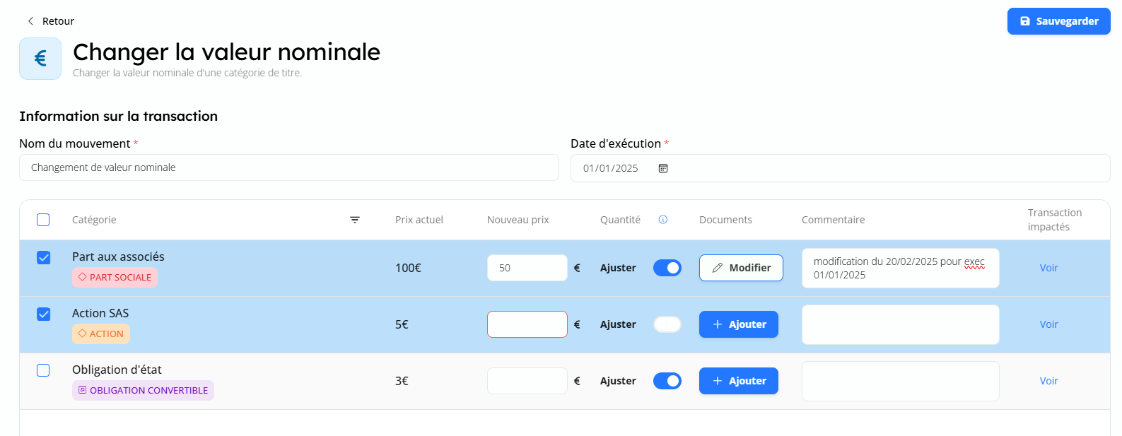 • Plusieurs amĂ©liorations ont Ă©tĂ© apportĂ©es dans le menu “Titres > Effectuer un mouvement > Modification > Changer la valeur nominale”