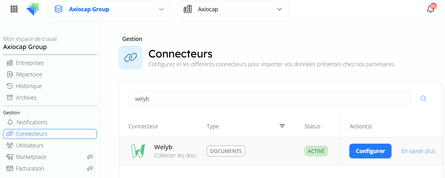 • 2 nouveaux partenaires sont intĂ©grĂ©s Ă  la solution Axiocap et permettent l’import rapide de vos sociĂ©tĂ©s depuis la pages des connecteurs.