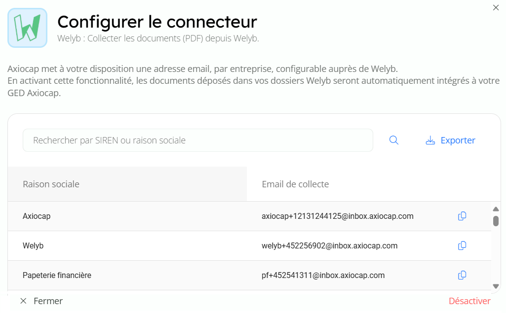 • Un e-mail collecteur est gĂ©nĂ©rĂ© automatiquement pour chaque entreprise enregistrĂ©e dans Axiocap.